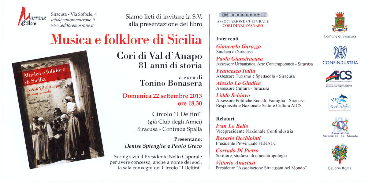 Editore. Ingresso libero.“È il primo aprile 1932 quando per la prima volta i “Cori di Val d’Anapo” si esibiscono su un palcoscenico allestito al Foro Italico. È il loro primo grande successo e, da allora, tutti i dirigenti dell’OND siracusano guardano con occhio benevolo a questo sodalizio che in fondo rappresenta un elegante biglietto da visita della città da inviare in giro per il mondo…”