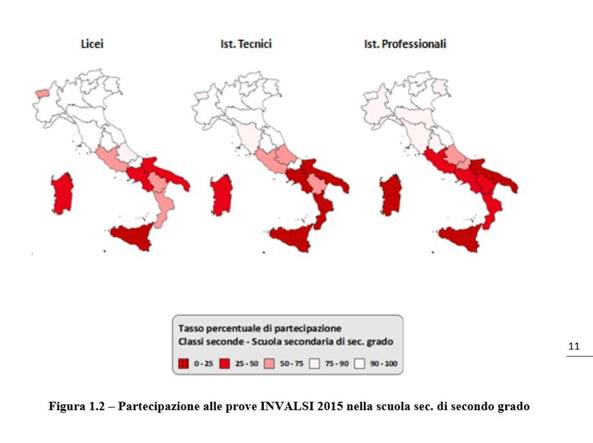 sono svolte nelle seconde superiori si legge: Sicilia, partecipazione 11,6 (licei) 10,0 Istituti tecnici, 6,5 istituti professionali. Poco meglio la Puglia (2 licei su 5 e 1 istituto tecnico su 6) e la Campania (1 liceo su tre e 1 istituto tecnico su 6) «È fallito il dato censuario - spiega Annamaria Ajello, presidente dell’Invalsi che solo lo scorso anno poteva celebrare un dato eccezionale, oltre il 98 per cento delle scuole avevano sottoposto i ragazzi al test di valutazione dell’apprendimento - avremo un buco in molte regioni per il 2015, ma stiamo lavorando per avere statistiche attendibili». Come? I funzionari del Miur che hanno compilato il rapporto spiegano che «mediante opportune tecniche statistiche, che saranno oggetto di uno specifico approfondimento metodologico che l’Invalsi pubblicherà entro dicembre, sono stati ricalcolati i pesi delle scuole nelle regioni con alti tassi di astensione in modo che la rappresentatività nazionale fosse garantita», insomma si sono rivolti all’Istituto nazionale di Statistica per cercare di mettere una pezza.